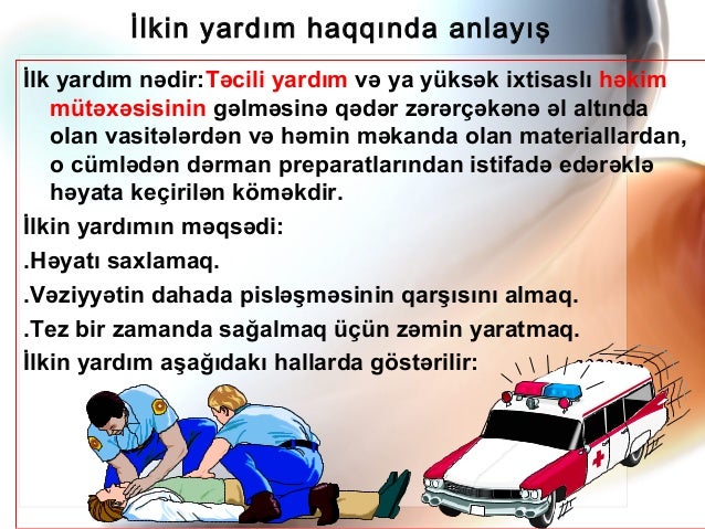 Ilk tibbi yardim. Qanaxmalar zamanı ilk tibbi yardım qanaxma istənilən güclü qanaxma zamanı əsas təhlükə ondan ibarətdir ki orqanizm daxilində qan kütləsinin kəskin şəkildə azalması nəticəsində ürək fəaliyyəti pisləşir. Ilk tibbi yardım hər hansı bir qəza və ya sağlamlıq üçün təhlükəli vəziyyət yarandıqda xəsarət almaış adama tibb işçiləri gələnədək göstərilən yardımdır. Müəllimlər üçün hazırlanmış bu vəsait təcili yardım stansiyasının tibb heyəti sahə və ailə həkimləri.