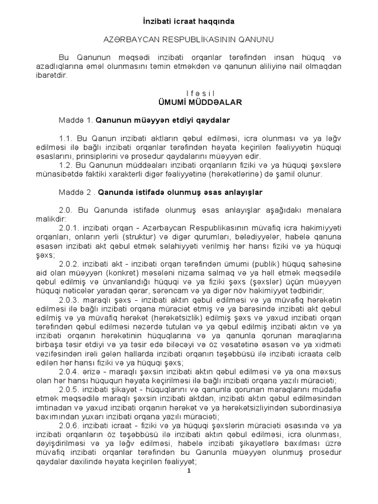Inzibati ərazi bölgüsü idarəetmənin qanunçuluğun vətəndaşların hüquqlarının azadlıqlarının və qanuni mənafelərinin dövlət hakimiyyəti orqanları tərəfindən təmin edilməsinin səmərəli təşkili məqsədi ilə azərbaycan respublikasının ərazisinin unitar dövlət kimi müəyyən hissələrə bölünməsidir. I fəsil ümumi müddəalar maddə 1. Bu qanunun 28 1 2 ci maddəsində nəzərdə tutulmuş hallarda inzibati icraat maraqlı şəxsə icraat haqqında məlumat verildiyi və ya maraqlı şəxsə münasibətdə ilk prosessual hərəkətin həyata keçirildiyi andan başlanır.